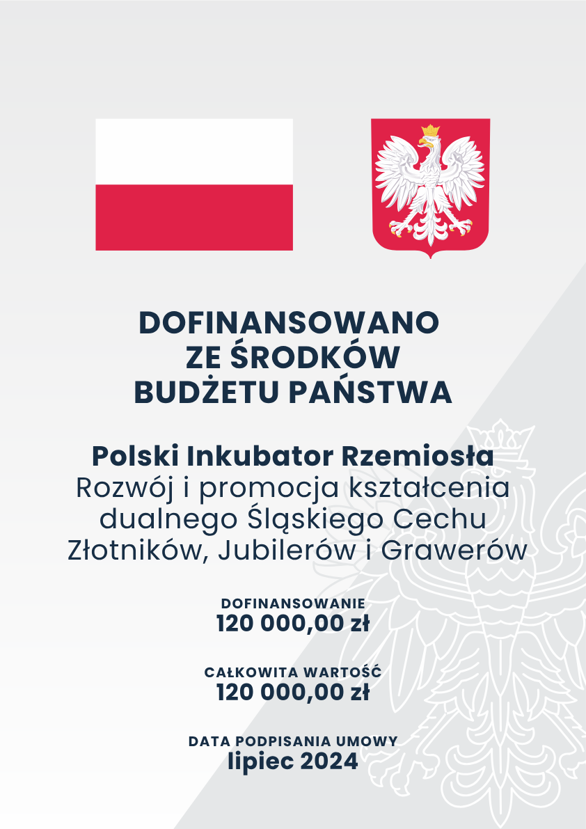 W dniu 2024-07-23 Śląski Cech Złotników, Jubilerów i Grawerów podpisał z Narodowym Instytutem Wolności – Centrum Rozwoju Społeczeństwa Obywatelskiego umowę o dofinansowanie zadania pt. „Rozwój i promocja kształcenia dualnego Śląskiego Cechu Złotników, Jubilerów i Grawerów” realizowanego w ramach Rządowego Programu Polski Inkubator Rzemiosła na lata 2021-2030 r.